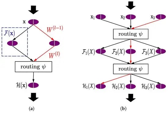 (a) Basic single routing gate, current AI technology (b) Capsule Network with skip path highlighted in red.